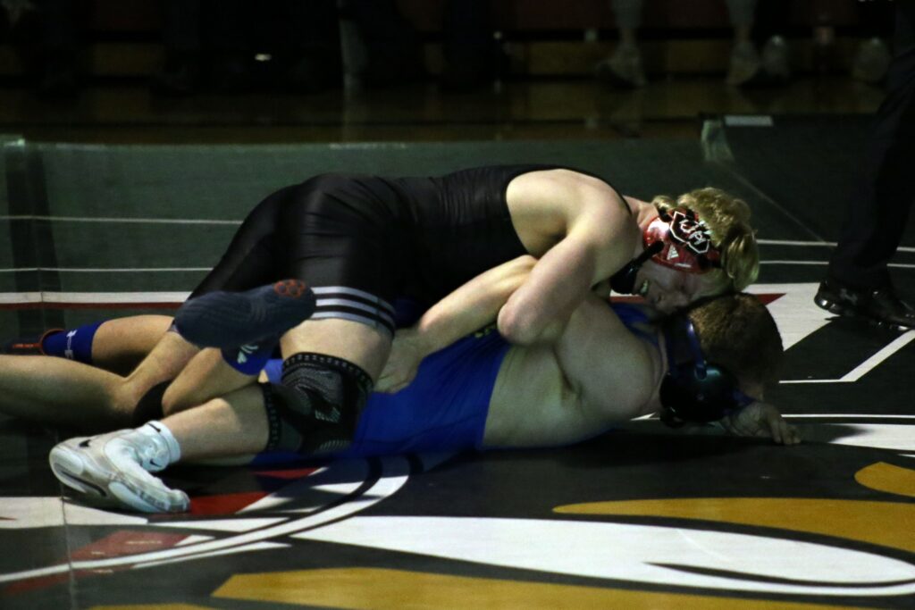 The Golden Eagles won the next three matches with pins. Jude Summer pinned Jacob Milliron in 4:22 at 144 and Porter Lozenski pinned Ty Delbridge in 3:15 at 150. Luke VanVlymen was pinned by Ridley Waldo in 1:49 at 157.
