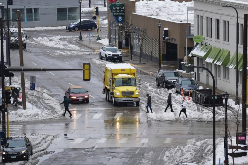 The snow turned into rain early Monday in Minneapolis, making for a slushy morning commute. Some schools in Minnesota closed. Almost three dozen flights were canceled at Minneapolis-St. Paul International Airport, and more than 100 were delayed.