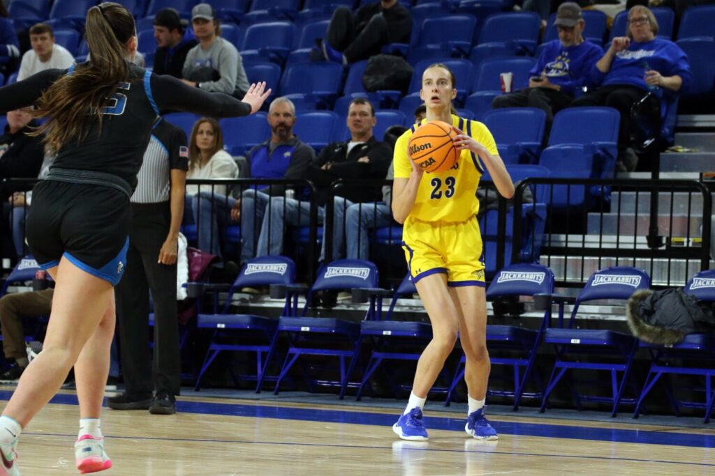 SDSU shot 52.5% from the field and was 4-of-13 from three. Brooklyn Meyer led the Jacks with 21 points and six rebounds. Madison Mathiowetz had 13 points and Paige Meyer had 10 points, eight rebounds and eight assists. Mesa Byom was 1-of-9 from the field but had 11 rebounds and six assists.